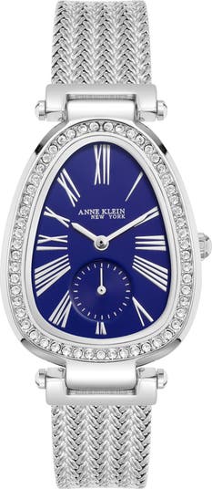 Glam up your everyday look with this Milanese mesh-strap bracelet watch featuring an oval dial framed by Roman numeral indexes and a sparkly crystal bezel.