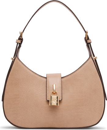 A lock-adorned strap adds a utilitarian flourish to a structured faux-leather shoulder bag designed with textured embossing.