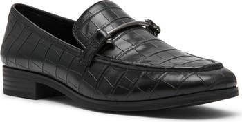 A gleaming buckle trims the vamp of a polished loafer comforted by a cushioned footbed and flexible sole.