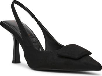 A cushioned footbed and statement heel give an elegant lift to a polished slingback pump that deserves a place in any wardrobe.
