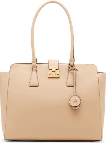Polished hardware and subtle branding lend minimalist appeal to a structured tote bag designed to be carried by the top handles or crossbody strap for versatile options.