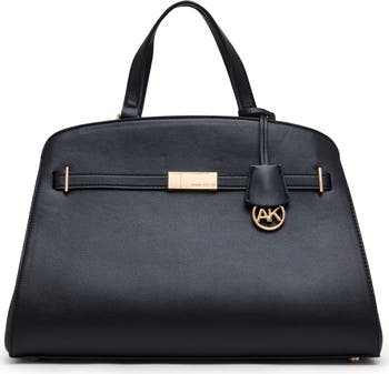 Finessed with gleaming hardware, this posh satchel bag features a divided interior for quick access to your day-to-day essentials while an optional crossbody strap allows for hands-free wear.