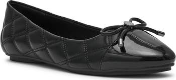 Targeted cushioning and a flexible grip sole keep you light on your feet in darling ballet flats detailed with a glossy cap-toe, logo-trimmed bow and diamond-quilt stitching.