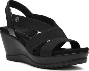 Elastic straps boost the comfort of this caged slingback sandal lifted by a modest wedge heel and grippy platform sole.