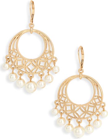 Show off elegant shine with these frontal drop earrings suspending latticed open circles and shaky glass-pearl drops.