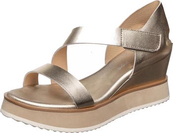 An asymmetric vamp strap offers contemporary styling to this warm-weather-ready sandal lofted by a platform wedge heel.