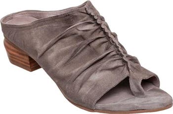 A ruched vamp with a gathered center seam brings contemporary style to a sleek mule elevated by a low stacked heel.