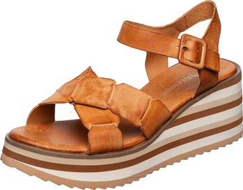 Multicolored stripes detail the wedge heel and platform of a breezy ankle-strap sandal fitted with a lightly cushioned footbed.