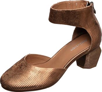 A round toe and block heel balance a sleek leather pump fashioned with a back zipper for easy entry.