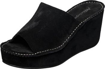 Buttery suede defines this luxe slide sandal with a sky-high wedge heel and supported platform sole.