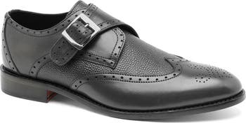 A wingtip and brogue details add vintage-inspired appeal to this pebbled-leather monk shoe balanced on a Goodyear welted sole.