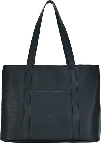 A spacious faux-leather tote features well-organized zip pockets to make work, school or travel a breeze.