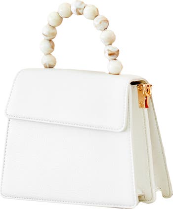 A tapered silhouette and gleaming hardware bring contemporary appeal to this structured bag with glossy beaded top handle and versatile crossbody strap.