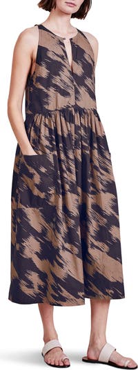 A brushstroke print adds to the casual ease of this summery midi cut in a sleeveless silhouette from earth-friendly organic cotton.
