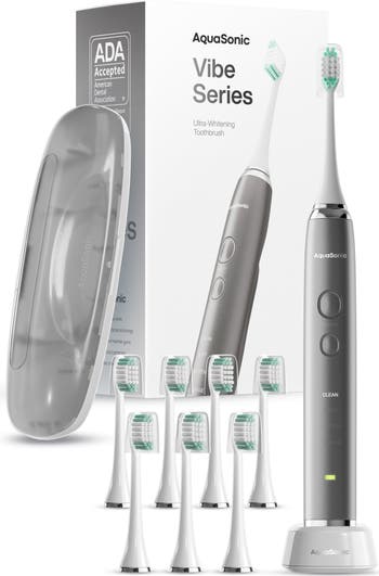 AquaSonic Vibe series is a world class modern electric toothbrush packed with the most up to date technology in sleek awe inducing colors. It features an ultra-powerful and industry leading motor producing 40,000 vibration per minute , ultra-fast wireless charging, 4 mode operation, smart vibration timers, 8 DuPont engineered brush heads and bristles, and a travel case; all with a sleek ultra-slim, lightweight and IPX7 waterproof design.
