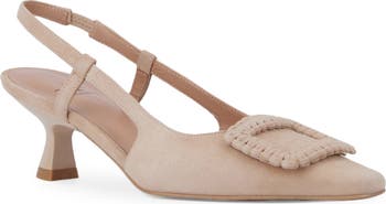 A woven ornament stands out at the vamp of a slingback suede pump balanced by a slender square toe and flared kitten heel.