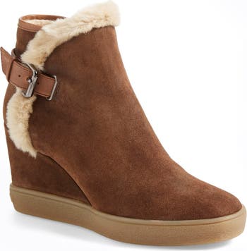 Plush faux fur lines the shaft and topline of a buckle-embellished wedge bootie protected by Aquatalia's signature weatherproof treatment.
