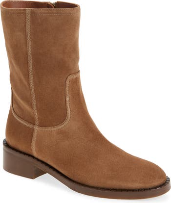 A round toe silhouette and walkable heel enhance the wearability of this soft suede boot outlined in tactile topstitching.