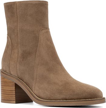 Tonal stitching and a signature weatherproof finish lend modern elements to a versatile bootie balanced by an almond toe and stacked block heel.