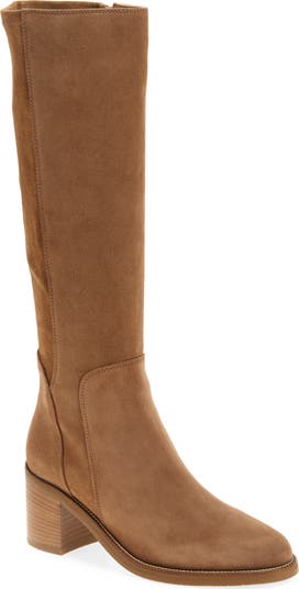 A plain toe and stacked block heel balance a knee-high suede boot featuring a signature fuss-free water-repellent finish.