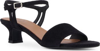 A classic round toe and chunky kitten heel balance a versatile sandal secured with an adjustable strap at the ankle.