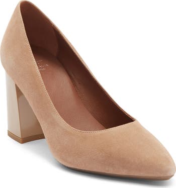 A walkable block heel delivers elevation to this pointy-toe pump lined with breathable leather.