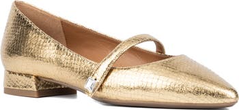 A faceted jewel embellishment details the slender mary jane strap on a metallic leather flat fashioned with a pointy toe for contemporary appeal.