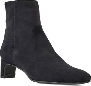 A plain toe and slim heel balance the sleek profile of this weatherproof suede bootie designed to complement workday and weekend looks.