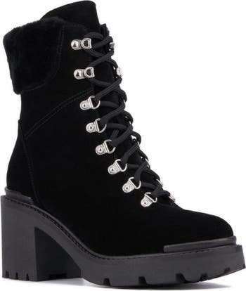 Gleaming eyelets secure the lace-up silhouette of this platform lug-sole boot lined with plush faux shearling.