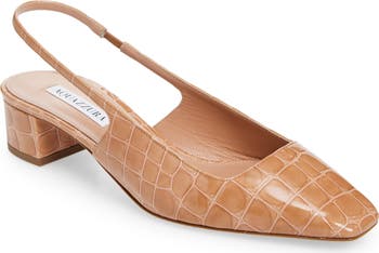 A softy squared toe and block heel lend geometric elements to this walkable slingback pump done in luxe croc-embossed leather.