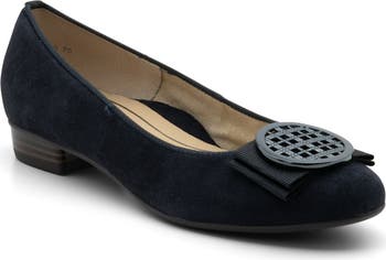 A lattice brooch rests on a flat grosgrain bow that dials up the elegance of this low-heel pump.