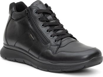 A side-zip closure traces the smooth leather vamp of a cushy sneaker featuring a breathable, waterproof Gore-Tex® membrane and lightweight traction sole.