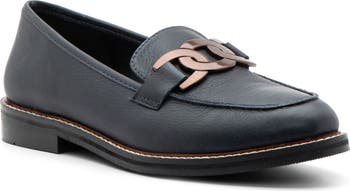 Polished chain-link hardware enriches the instep of a sophisticated loafer grounded by a well-cushioned footbed for lasting comfort.