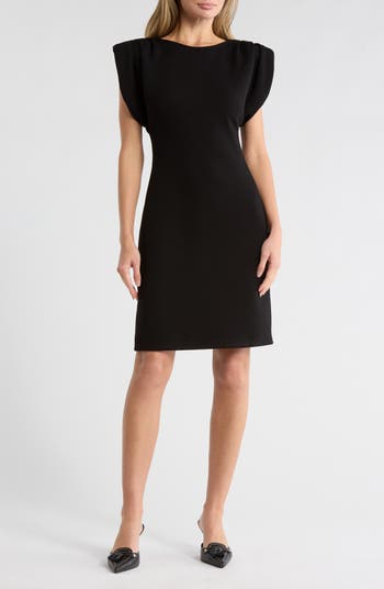 Flared cap sleeves enhance the contemporary minimalist styling of this cocktail dress cut from stretch-enhanced fabric at a leggy length.