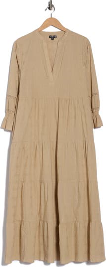 Channel boho appeal in this long-sleeve dress detailed with embroidered eyelets for a cool, breathable feel. A flattering V-neck and tiered, midi-length skirt detail this breezy dress.