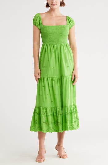 A smocked bust flows into a breezy tiered skirt decorated with airy embroidered eyelets and scalloped hem for an effortlessly elegant style.