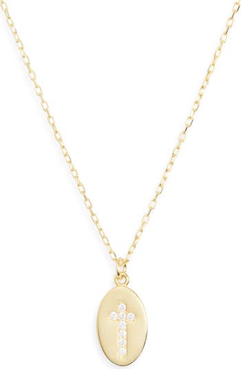A dainty cubic zirconia cross illuminates this mini oval pendant necklace crafted from sterling silver and plated in warm 18-karat gold.