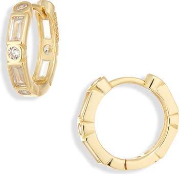 Baguette-cut and round cubic zirconia sparkle from polished huggie-hoop earrings crafted from sterling silver and plated in warm 18-karat gold.
