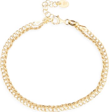 Slinky links shine elegantly along a flexible double-chain bracelet plated in a gleaming goldtone.