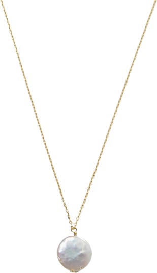 A delicate sterling silver chain is plated in warm 18-karat gold and anchored by a lustrous coin-pearl pendant.
