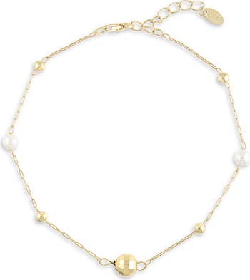 Milky freshwater pearls and ball charms station around this dainty chain bracelet plated in warm 18-karat gold.