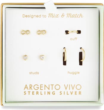 Two studs, a pair of huggie hoops and a darling cuff define a polished set of earrings that look great mixed and matched or can be styled separately for minimalist charm.