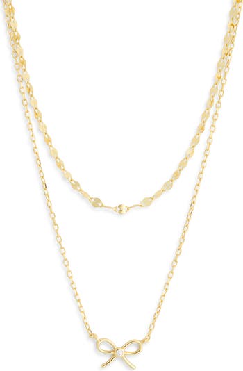 Gleaming goldtone plate adds a polished finish to this multi-layered chain necklace anchored by a bow-shaped CZ pendant for added sparkle.