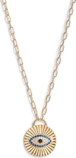 A sparkling evil eye pendant serves as the focal point for a statement-making necklace made from sterling silver links plated in 14-karat gold.