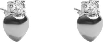 Faceted cubic zirconia sparkle atop heart-shaped stud earrings crafted from sterling silver or sterling silver plated in 18-karat gold.