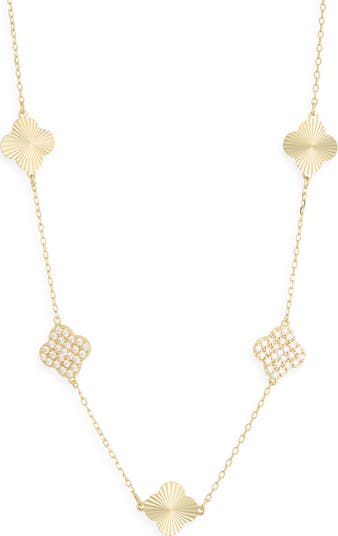 Pavé and textured clovers station around this dainty chain necklace made from sterling silver plated in 18-karat gold.