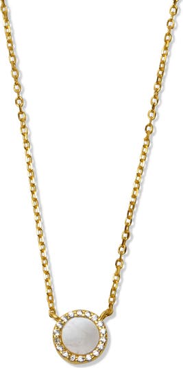 A cubic zirconia halo frames a lustrous mother-of-pearl pendant on this sterling silver necklace plated in warm 18-karat gold.