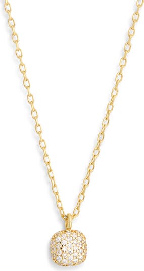 This goldtone-plated sterling silver necklace features a petite square pendant encrusted with pave-set cubic zirconia.