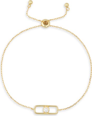 A cubic zircona shines brightly from the center of a round-shaped charm that defines a slider bracelet crafted from sterling silver and plated in warm yellow gold.