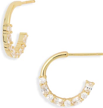 Round- and emerald-cut cubic zirconia stones accent these small hoops, perfect for daytime or evening ensembles.